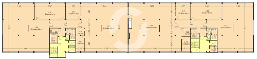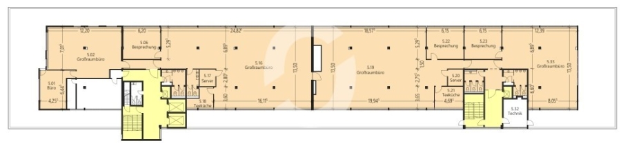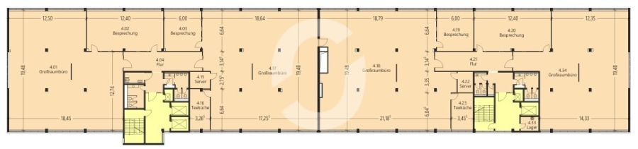 Die Gesamtfläche beträgt ca. 6.700 m². Eine Anmietung ist ab 450 m² möglich. Die zwei Treppenhaus-, Aufzugskerne und Sanitärkerne je Geschoss liegen jeweils mittig der Haushälften. Die Sanitärkerne sind in 2012 erneuert worden und dementsprechend modern gestaltet.